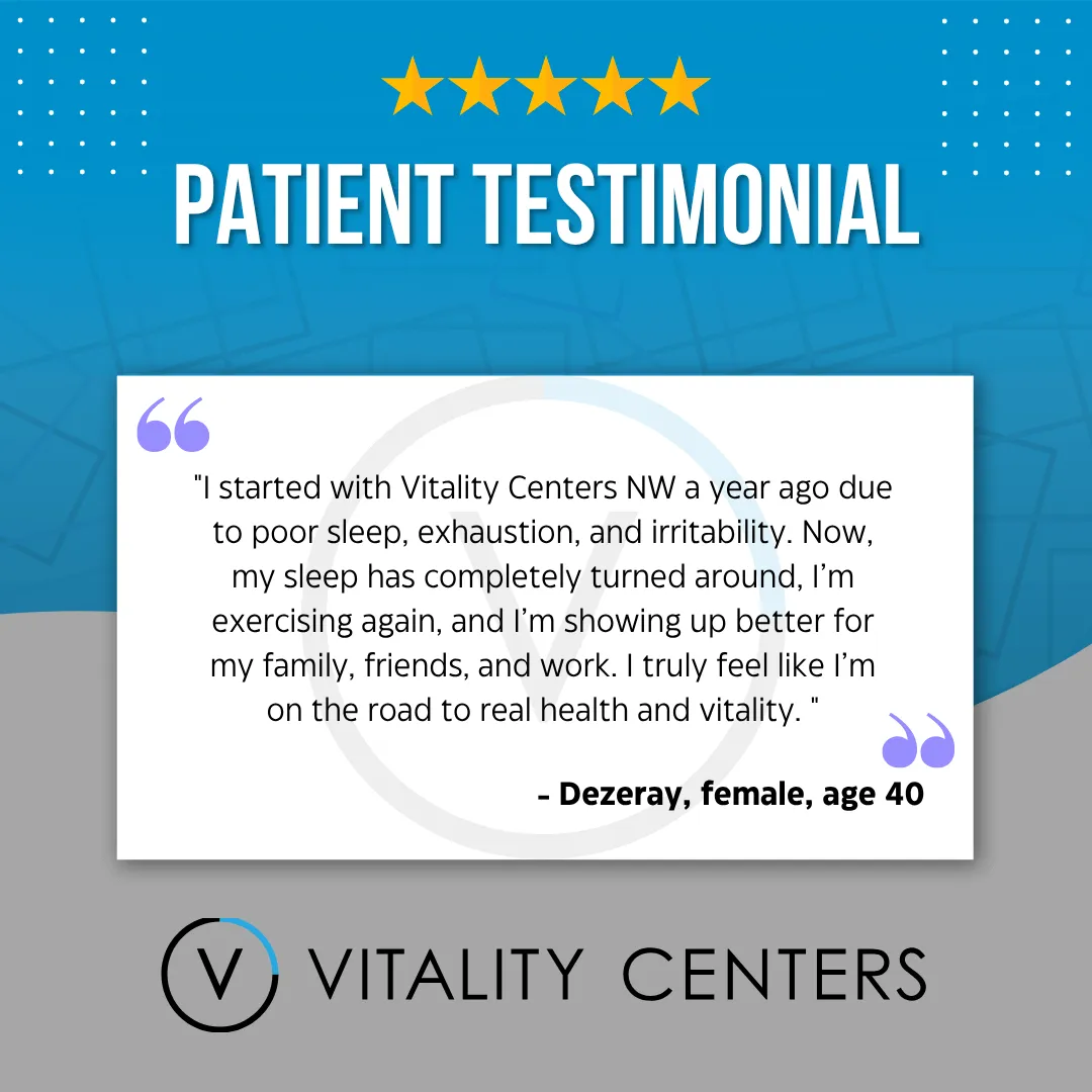 "I started with Vitality Centers NW a year ago due to poor sleep, exhaustion, and irritability. Now, my sleep has completely turned around, I’m exercising again, and I’m showing up better for my family, friends, and work. I truly feel like I’m on the road to real health and vitality. "
