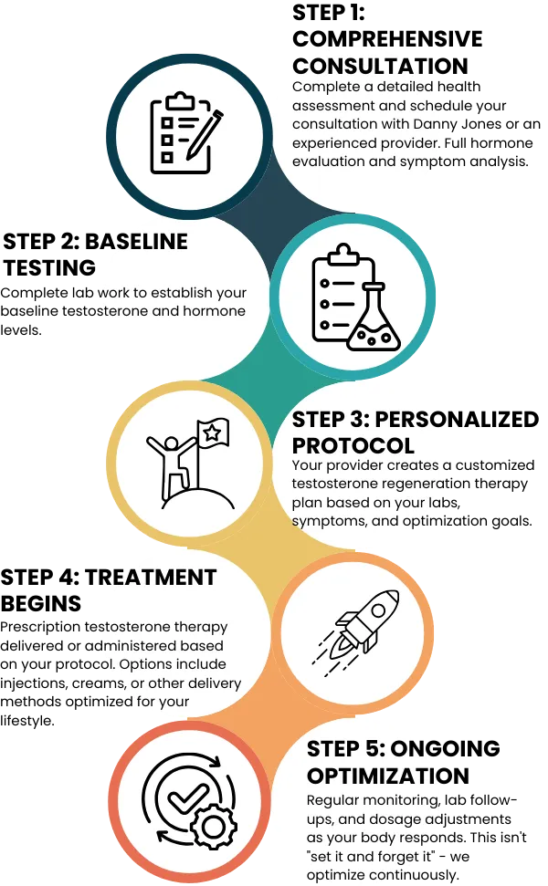 Danny Jones and our team of board-certified providers specialize in hormone replacement therapy for men. Not a rotating telehealth provider reading from a script - dedicated medical professionals who understand male hormone optimization.